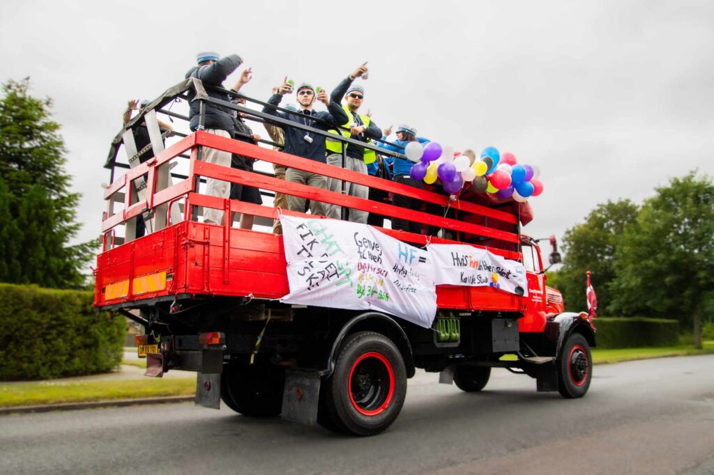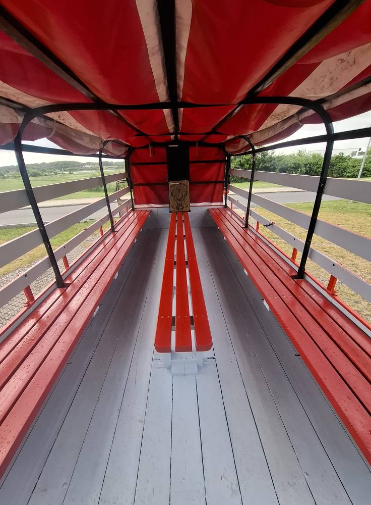 På vognen er 2x soundboks, I styre derfor selv jeres playliste via bluetooth. Vognen er indrettet med bænke der giver godkendte pladser til i alt 26 studenter. Yderligere er der plads til 2 elever foran. Hvis vejret er med os, kan presenningen rulles op og festen kan ske i solskin med vinden i håret.